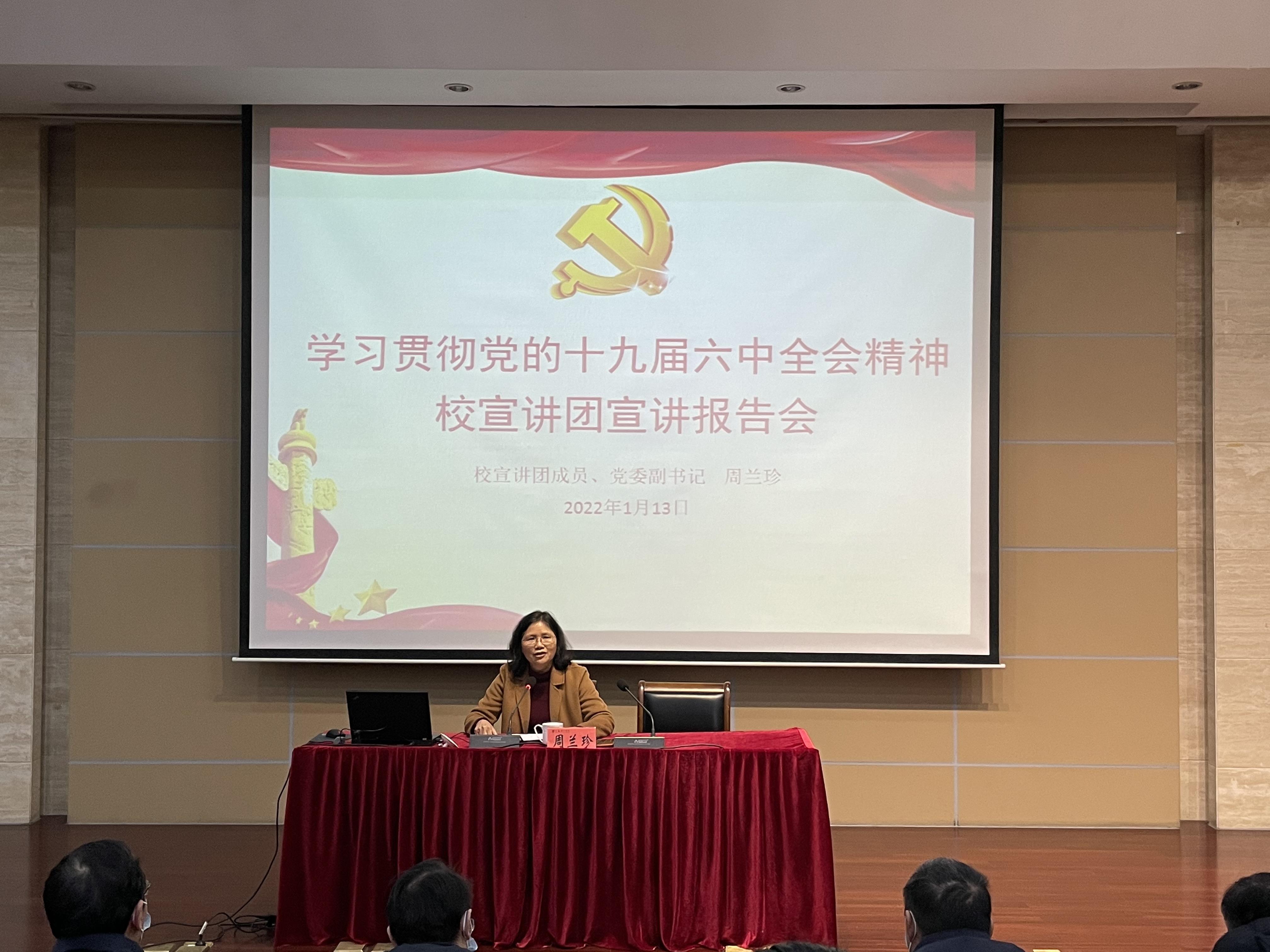 为全面深入学习领会党的十九届六中全会精神,深刻理解党的十九届六中全会的重大意义和作用。1月13日上午,校宣讲团成员、党委副书记周兰珍在图书馆南报告厅作“学习贯彻党的十九届六中全会精神”专题报告。我院党政领导、体育部党政领导、我院和体育部全体教职工参加了此次报告学习。本次报告由体育部党总支书记季敏主持。