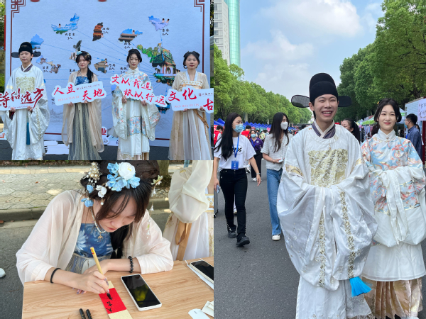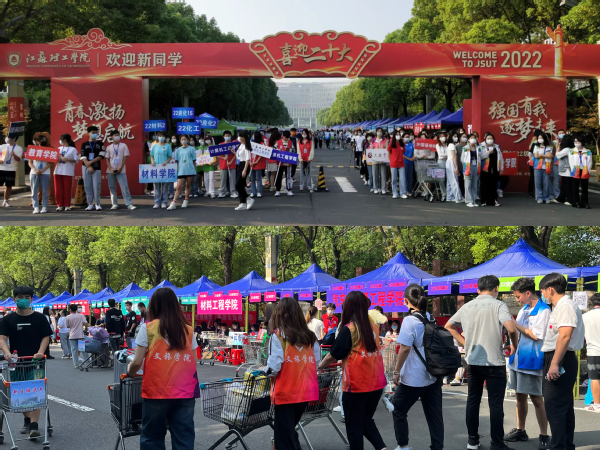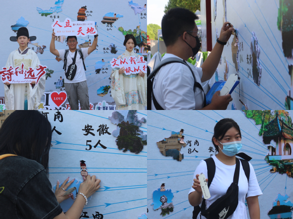在报到现场,学院秘书系张英老师结合地方文化、专业特点以及未来就业,特意以“师范”“旅游”“酒店”“文秘”专业名称为题创作了藏头诗句,体现了专业教师的用心和期待;身着汉服的特色迎新志愿者,现场挥毫泼墨,彰显了学院深厚的文化底蕴;院学生会成员在每位新生的入学材料袋中都放置了一张专属的书签,书签上写满了对新同学的祝福和期许,体现了学院暖心的人文关怀;在迎新特色展示区,学院根据新生生源省份结构分布和数量情况,喷绘制作了生源省份的地图,新生报到时,可以用贴纸上写下自己的专业姓名,再将其粘贴在家乡的地图旁。每个小地图都指向了学校的所在地江苏省,寓意来自五湖四海的求学青年,将在江苏理工学院成长为国之栋梁。