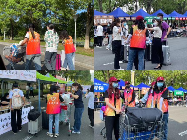为助力我院迎新工作顺利进行,学院团委征集选拔了百余名学生志愿者,他们统一着装,准时集结在迎新场地,以最饱满的热情、最暖心的笑容迎接每一位新同学的到来。新生于校园门口通过严格的体温监测、核对核酸检测结果、查验行程码与健康码后进入校园,志愿者们接过新生手中的行李箱,引导大家完成报到流程和核酸检测,帮助新同学签到合影。在将新生送往寝室报到的途中还充当起“校园导游”的角色,向新生们介绍了学校、学院及周边的学习、生活环境,让新生能够更好地适应大学生活。志愿者们热情周到的服务让新生倍感温暖,有条不紊的接待工作更让新生们感受到了来自文旅学院大家庭的温暖。