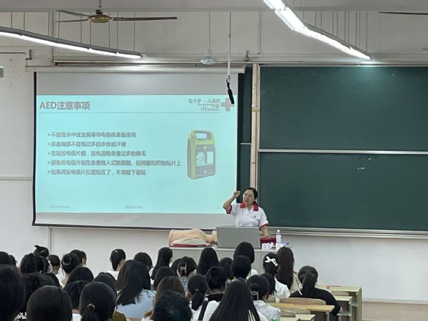本次教育活动主要分为安全急救培训和传染病预防教育两个章节。红十字急救培训中心的老师向同学们科普了心脏骤停病人的表现,警示新生要注意把握救治的“黄金四分钟”,老师借助人体模型和机器向新生们讲解并示范了心肺复苏的急救过程,详细阐述了急救细节与各关键步骤,使同学们进一步了解到心脏骤停的急救技能。老师还通过与同学们互动,进行了应对气道异物梗阻实施海姆立克法的安全技能演示。