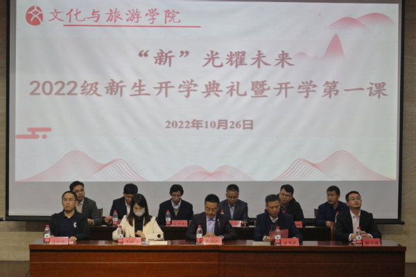 10月26日下午6点30分,文旅学院“新”光耀未来——2022级新生开学典礼暨开学第一课于图书馆北报告厅隆重举行。学院党委书记张羽程,院长演克武,党委副书记兼副院长李晓曼,副院长胡小海,副院长常如瑜,各专业系主任,全体辅导员、新生班主任以及2022级全体新生参加本次开学典礼。典礼还通过腾讯会议平台在云端为新生家长开启直播。