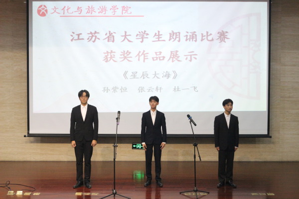 会上,孙紫恒、张云轩、杜一飞三位同学展示了江苏省大学生朗诵比赛获奖作品——《星辰大海》,该篇章节选自李大钊先生的《青春》,字字铿锵,句句有力,激发起每一位学生的赤子之心。