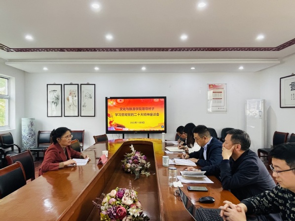 11月9日上午,文化与旅游学院领导班子在人文楼222会议室召开学习贯彻党的二十大精神座谈会,校党委副书记周兰珍出席会议,会议由文旅学院党委书记张羽程主持。