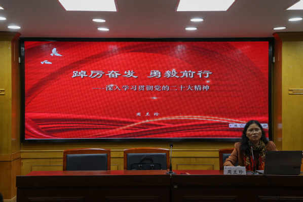 周兰珍以《踔厉奋发 勇毅前行》为主题,从深刻领会党的二十大的主题和成果,深刻领会过去五年的工作和新时代十年的伟大变革,深刻领会开辟马克思主义中国化时代化新境界,深刻领会新时代新征程中国共产党的使命任务,深刻领会中国式现代化的中国特色和本质要求,深刻领会全面建设社会主义现代化国家的重大部署,坚持学思用贯通、知信行统一七个方面,对党的二十大精神进行了全面深入系统的宣讲解读。
