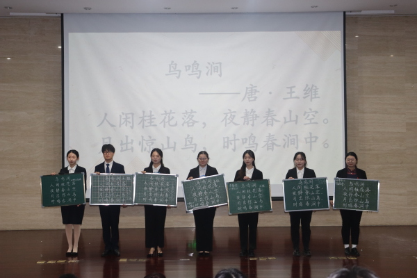 在主持人充满热情的开场之后,上课铃打响,师范生技能大赛正式开始。在第一环节中,选手们配合着精心制作的PPT,声情并茂地在三尺讲台上展开激烈的角逐。选手们展现出汉语言文学学子扎实的基本功和自然得体的教态,展现了未来教师的专业素养和教学风采。第二环节,选手们展示了自己的粉笔作品。评委老师们根据选手们粉笔字笔画标准程度、字体结构、版面整洁度等方面进行评分。比赛期间穿插的手语操,茶艺展示表演得到了观众和评委老师们的一致好评。