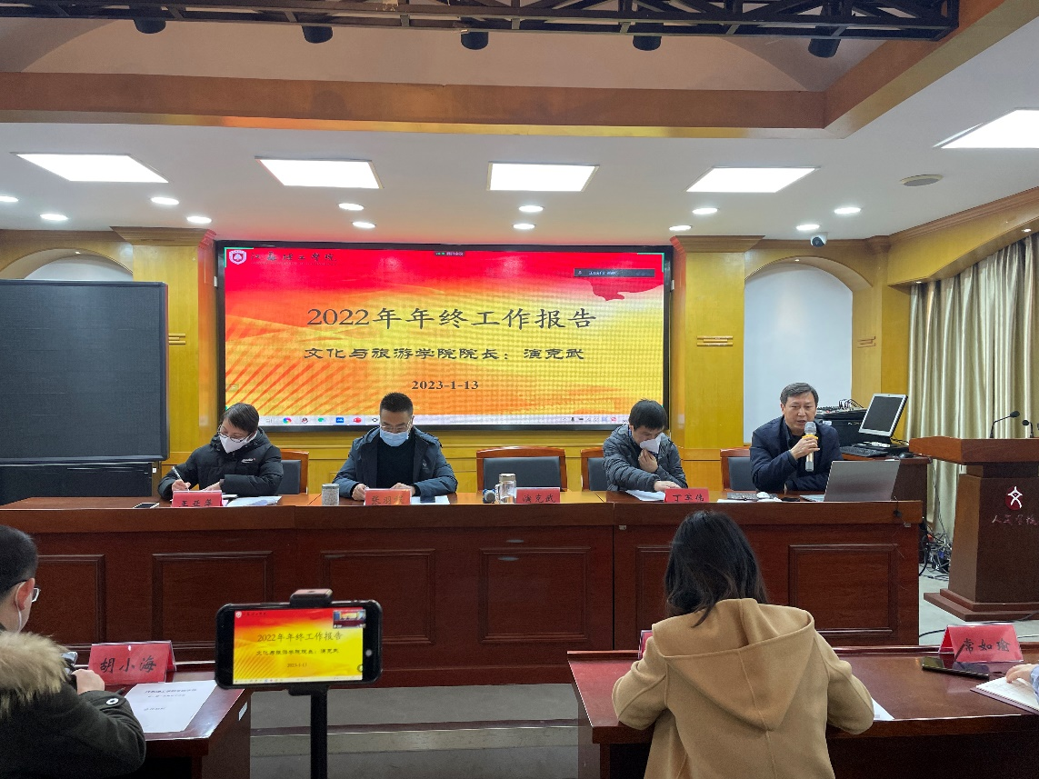 院长演克武作了《2022年工作报告》,报告主要从工作目标完成情况、高质量发展完成情况、存在的问题、改进的方法等方面对学院一年来的工作进行了全面总结,并就改进的方法及未来工作计划(如“六一工程”、“三成”目标)进行了展望。