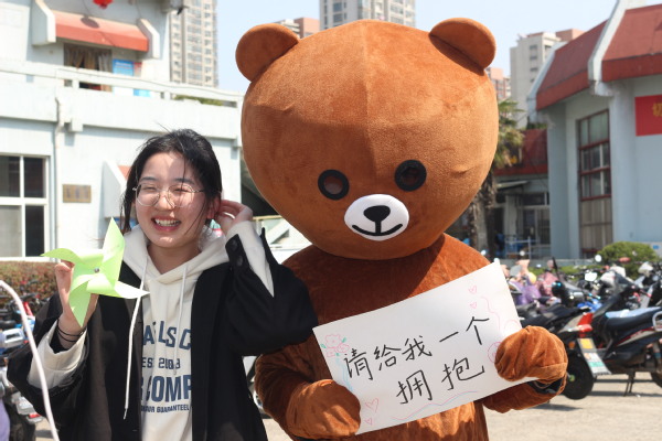 活动一经发起,同学们反响热烈,纷纷踊跃报名参加,在纸上写下寄语并制成“专属”风车,寓意“好风凭借力,暖春润我心”,助力自我心灵的健康成长。活动现场,一只“熊”拿着写有“请给我一个拥抱”的标语,邀请路过的同学参与,增添活动的“趣味性”和“温暖度”。同学们不仅可以跟“熊”拥抱,也可以与同学相互拥抱,表达最真挚的同学情。