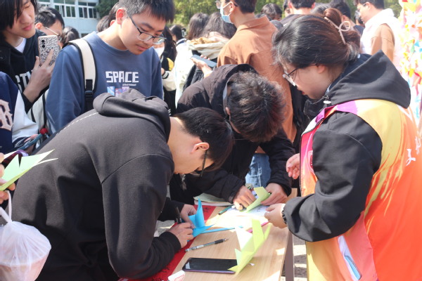 在中国传统文化里,风车被称为‘吉祥物’,它承载了幸福和希望,体现积极向上的正能量。活动中,路过的同学可以挑选喜欢的彩色卡纸,在上面写下自己的愿望和祝福,再叠成一个个风车串起来,以此慰藉忙碌的学习生活。