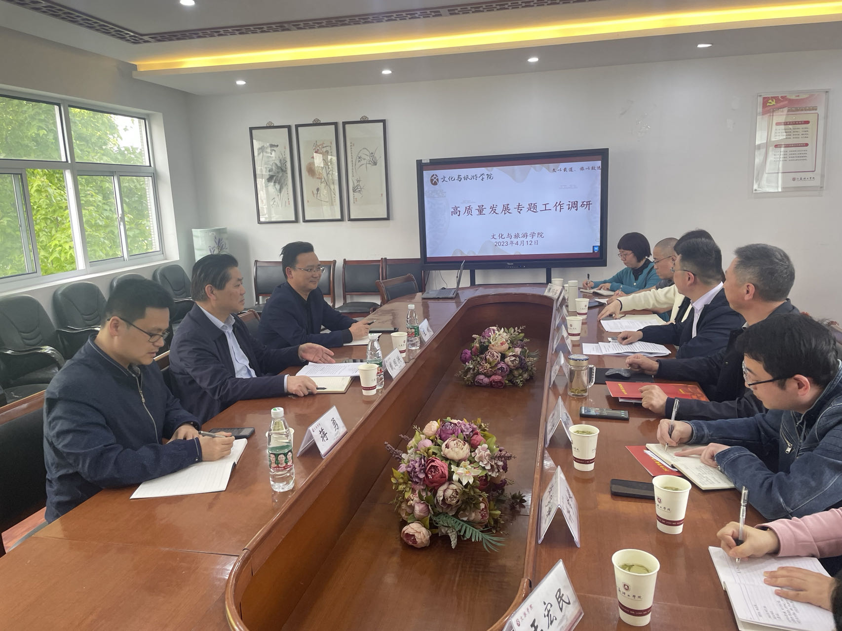 4月12日下午,校党委副书记、校长戴国洪在党办校办主任王斌、党办校办秘书科科长蒋勇的陪同下,来到文化与旅游学院开展高质量发展专题工作调研。学院党政领导班子、各科室负责人、系部主任参加调研会,会议由院党委书记张羽程主持。