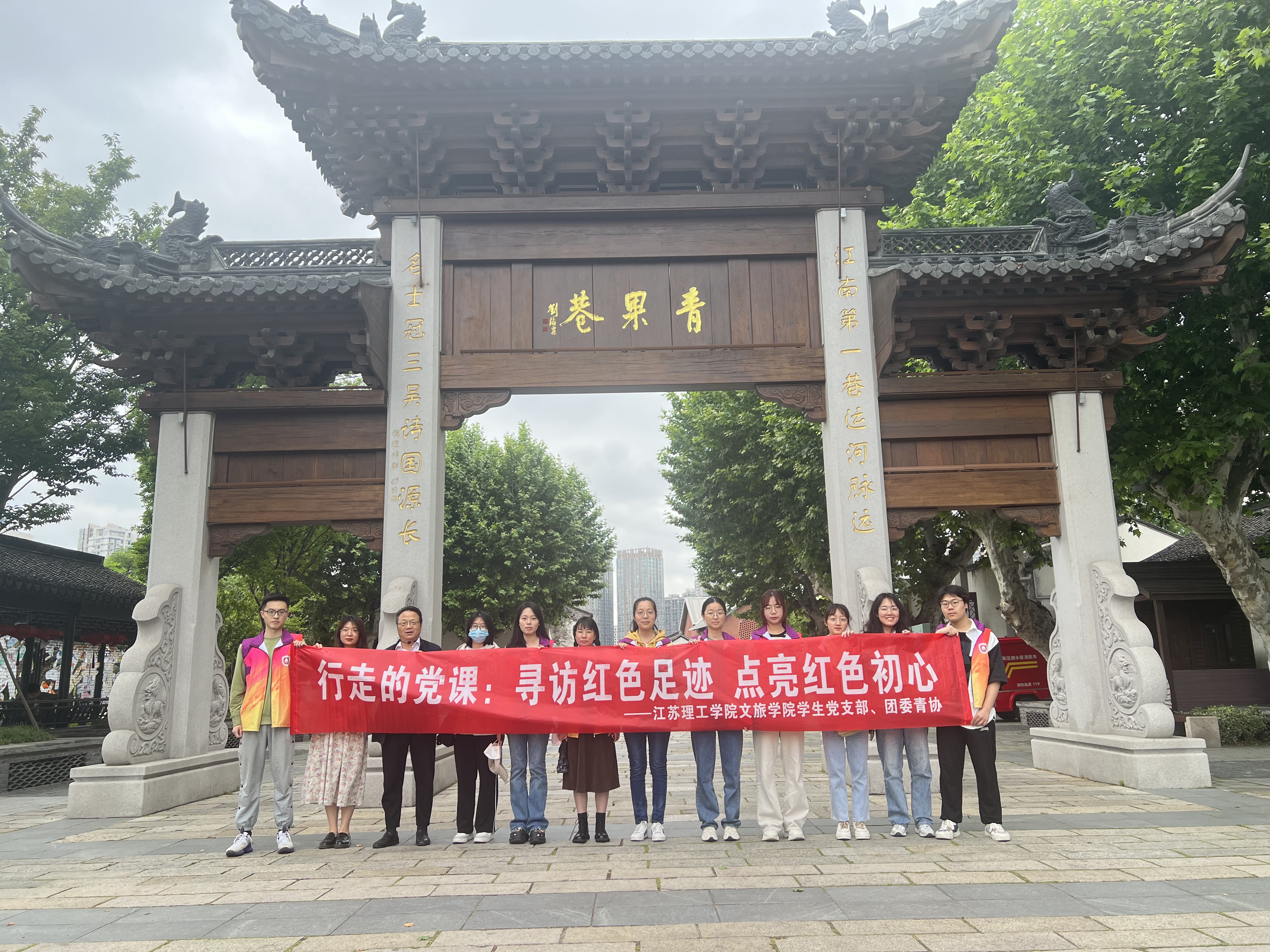 为深入学习贯彻党的二十大精神,丰富开展学习贯彻习近平新时代中国特色社会主义思想主题教育的形式,深学细照党的二十大报告中“用党的科学理论武装青年,用党的初心使命感召青年”,牢牢把握党史学习教育要求,将红色资源深度融入思政育人体系,5月18日下午,江苏理工学院文旅学院学生党支部前往青果巷开展“行走的党课:寻访红色足迹,点亮红色初心”活动。学生党员、入党积极分子、院第27期青年团校成员和青协志愿者代表参加本次活动。