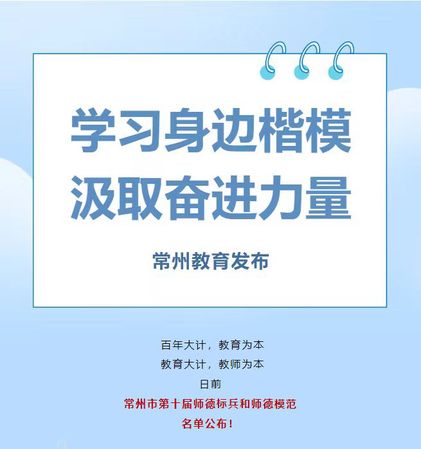 据悉,常州市“师德标兵”和“师德模范”评选工作,是全市大力弘扬人民教师高尚师德,推动师德师风建设的重要内容,评出的“师德标兵”“师德模范”均为全市各校中从事教育教学一线工作的在职教师,具有优秀的职业素养和高尚的教师职业道德。我校教职工将学习身边榜样,汲取奋进力量,深入学习贯彻党的二十大精神和习近平总书记关于教育的重要论述,在教育教学工作和师德师风建设中,以德立身、以德立学、以德施教、以德育德,立德树人,爱岗敬业,为人师表,教书育人。(图/常州教育发布;文/陈宝;审核/张羽程 张丽芬)