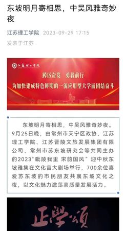 中秋佳节前夕,恰逢学校第三次党代会胜利召开之际,由天宁区政协、江苏理工学院、江苏晋陵文旅发展集团有限公司、市苏东坡研究会等共同主办,天宁区教育局、工人文化宫、天宁街道办事处、天宁城建、中粮.人瑞科技等共同承办的2023“毗陵我里 宋韵国风”迎中秋东坡雅集在文化宫大剧场成功举行。新华日报交汇点、常州日报、常州广播电视台、常州晚报、中吴网等多家媒体,常州政协、天宁政协、江苏理工学院官方微信公众号等平台给予关注,在常州市民中产生热烈反响,进一步提升了文化与旅游学院的知名度、美誉度和影响力,详见报道: