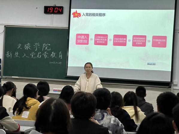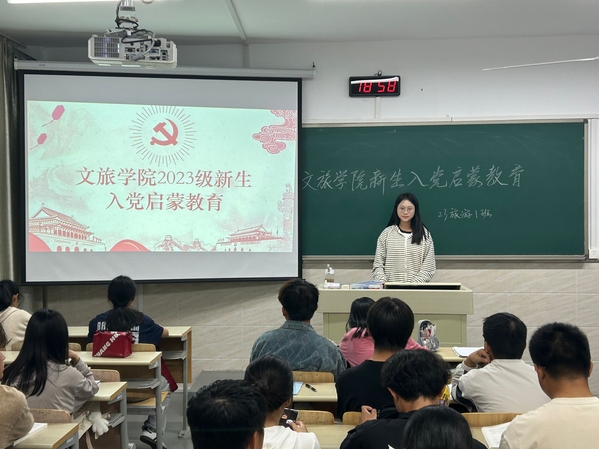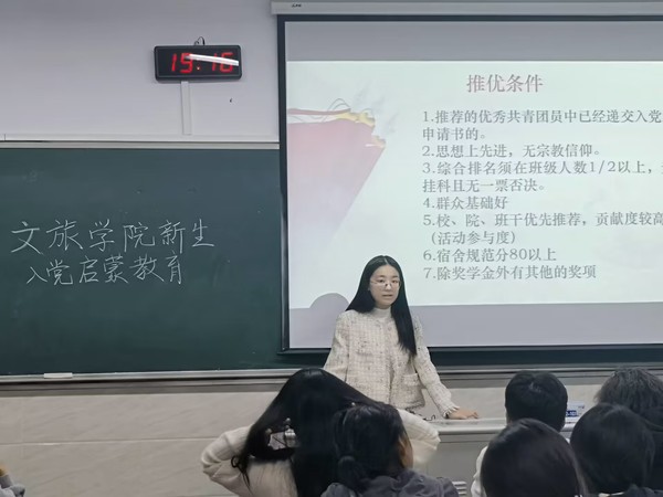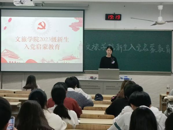 为了全面贯彻落实党的二十大精神,坚持以习近平新时代中国特色社会主义思想铸魂育人,做好新生入党启蒙教育,引导新生主动学习党的理论知识、深化对党的理解认知,成长为坚定不移听党话、跟党走、堪当民族复兴重任的时代新人,10月24日晚,由文旅学院学生党支部开展的入党知识宣讲培训在12号楼进行。宣讲团成员由蔡欣言、周末、孙美琳、盖付彤等组成,2023级全体新生参加。