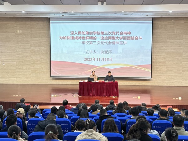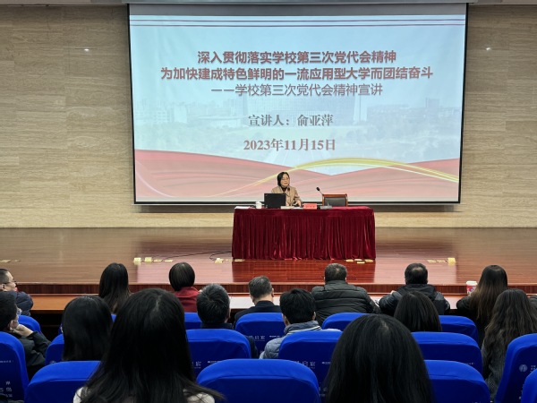 最后俞亚萍强调,在今后的工作和学习中,二级学院要紧紧围绕学校第三次党代会提出的奋斗目标,全面贯彻党的教育方针,落实好立德树人根本任务,坚持学以致用、用以促学,结合学校和学院高质量发展实际,把第三次党代会精神落实到本学院工作谋划、部署、推进的各个阶段,惟实励新、追求卓越,踔厉奋发、勇毅前行,为加快建成特色鲜明的一流应用型大学贡献力量!(文/刘宇宁;图/卞舒云;审稿/季敏)