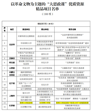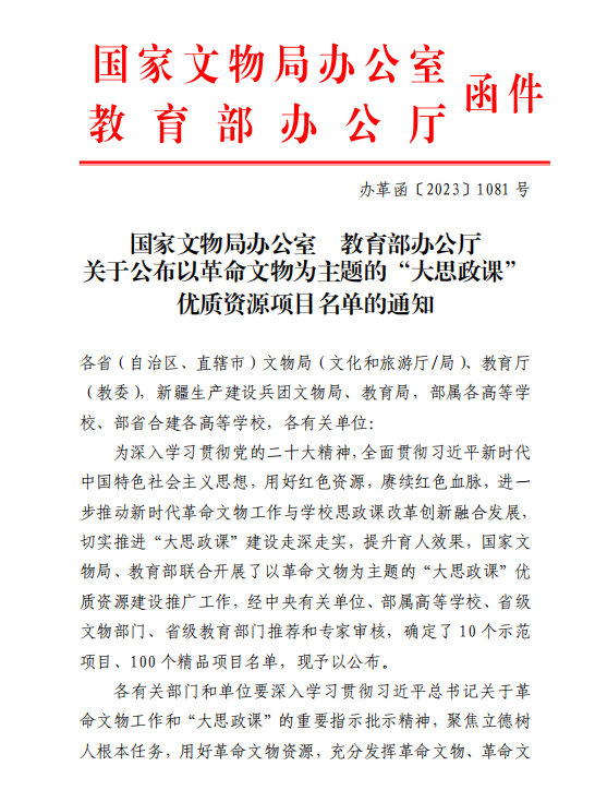 为深入学习贯彻党的二十大精神,全面贯彻习近平新时代中国特色社会主义思想,用好红色资源,赓续红色血脉,进一步推动新时代革命文物工作与学校思政课改革创新融合发展,切实推进“大思政课”建设走深走实,提升育人效果,国家文物局、教育部联合开展以革命文物为主题的“大思政课”优质资源建设推广工作,经中央有关单位、部属高等学校、省级文物部门、省级教育部门推荐和专家审核,确定了10个示范项目、100个精品项目名单。
