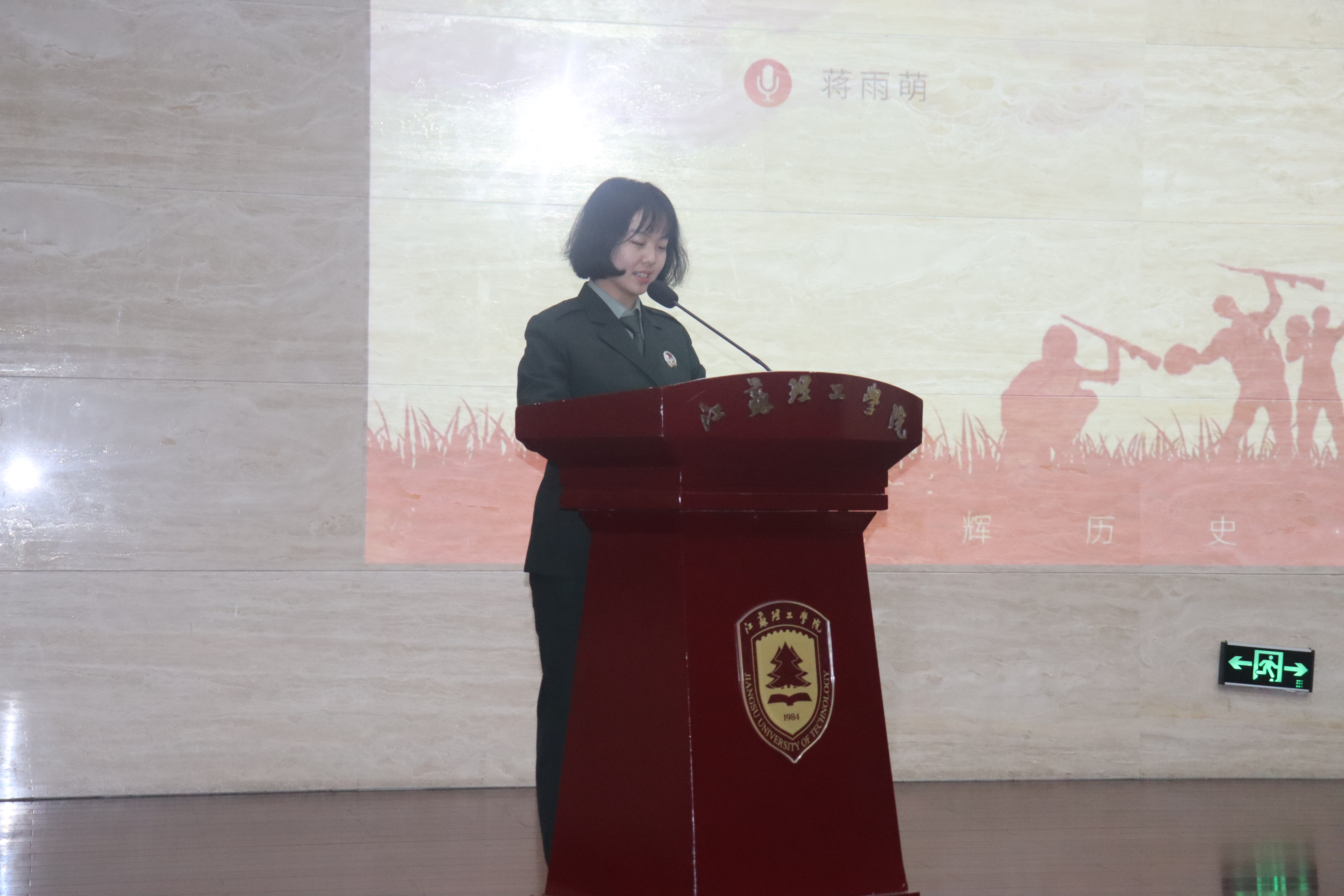 22酒店2ZD班蒋雨萌以《我和我的迷彩青春》为题,分享了自己擦干眼泪、剃掉长发、对艰苦的训练环境甘之如饴的从军故事。她告诉大家,军营教她成长,给予了她前行的勇气和顽强的斗志。希望同学们都能忠于理想,忠于信仰,做一朵人海中最奔涌的浪花!