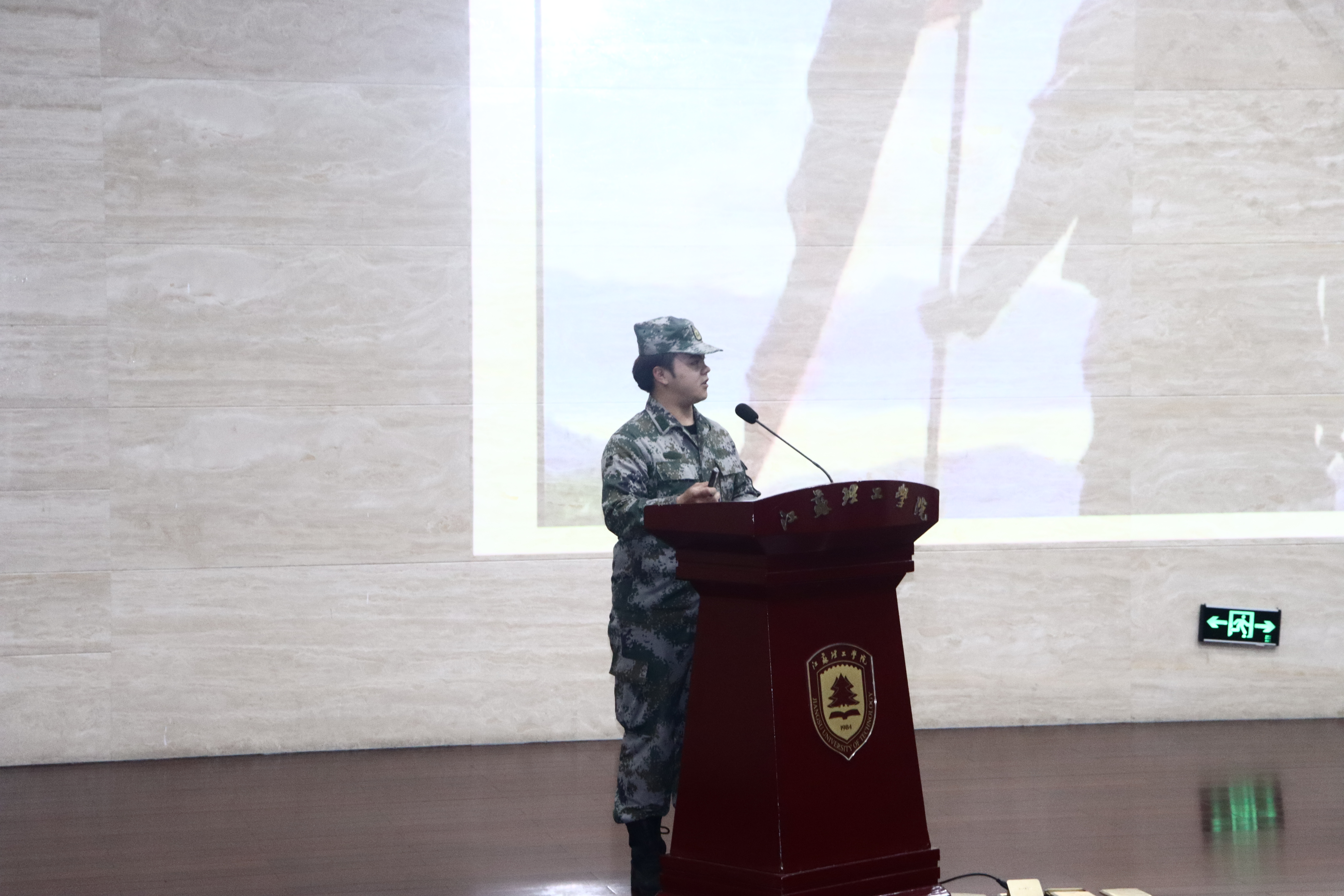 22旅游1班刘杨森以《我的军旅生涯》为题,分享自己远离家乡、踏上参军之路、对艰苦的训练环境甘之如饴的从军故事,他用自身的经历向大家展示了军人吃苦耐劳的坚强意志。