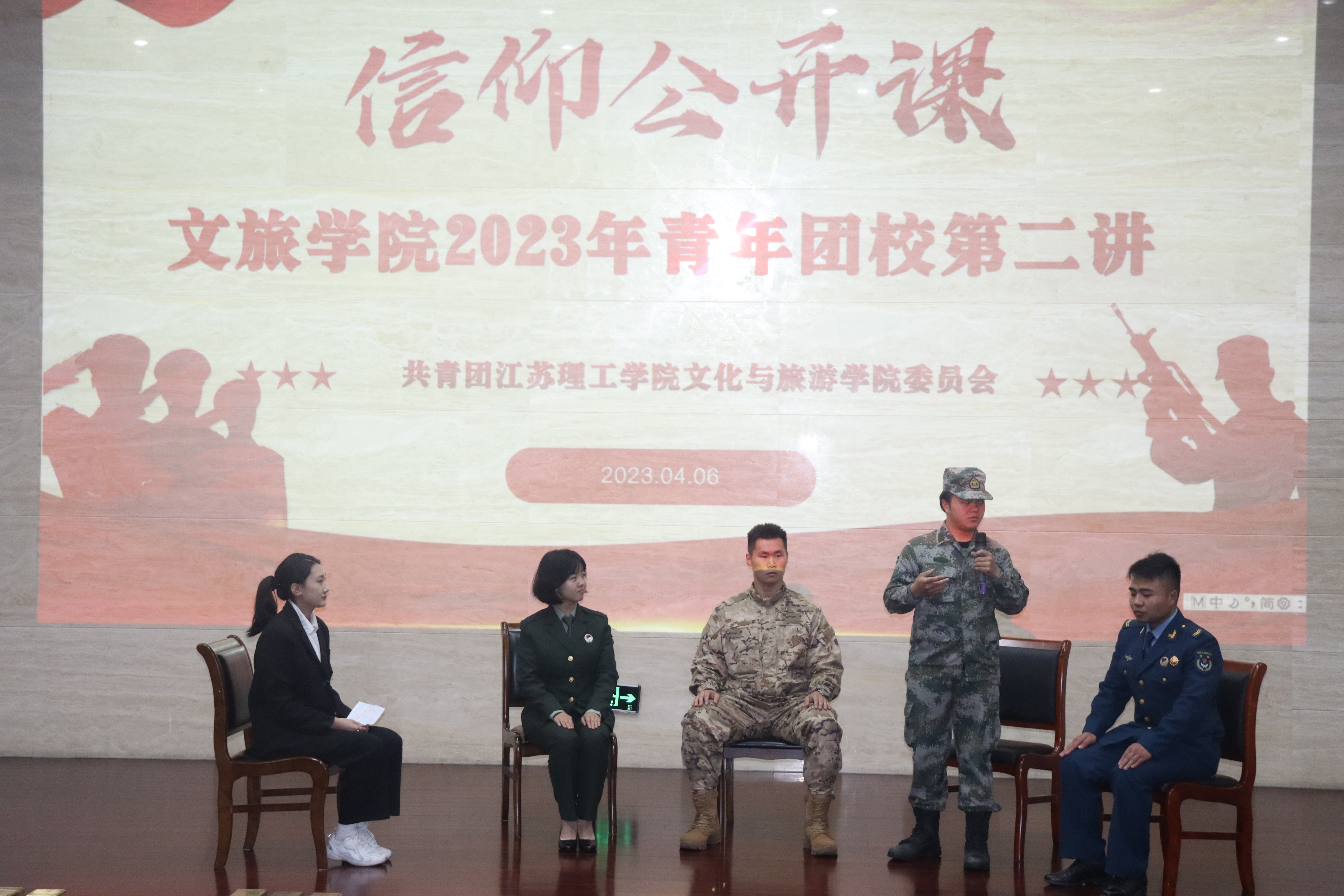 青春因磨砺而出彩,人生因奋斗而升华。为充分展现退役军人本色,厚植青年学生的爱党爱国爱社会主义情怀,引导青年牢固树立实现中华民族伟大复兴的中国梦,4月6日晚,文化与旅游学院于图书馆北报告厅开展了“与新时代同行,为中国梦奋斗”信仰公开课暨青年团校第二讲,邀请郭学威、蒋雨萌、刘杨森、戴浩忠等四位优秀退伍大学生分享自己的军旅生涯,分享他们的军旅生活和人生感悟。院团学骨干、2022级全体学生参与本次活动,活动由王潇涵主持。