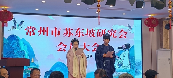 会长赵世平赞扬并感谢大家为东坡研究会在过去一年所做的工作,并就新一年如何更好地开展工作,强调要“扬正气、接地气、聚人气”。他说,扬正气,不仅做人做事要正,学风文风也要正;接地气,就是要尊重历史,结合常州实际,学习研究好东坡文化;聚人气,开展的活动既要能吸引人,又要让参与者有获得感。市政协二级巡视员孙如山对近年苏东坡研究会的工作进行了肯定,他说,苏研会的运作是规范有序的,研究成果也是可见可感的。作为一个聚焦于一位名人研究的社团组织,能够提交满满十页的年度工作报告,看得出工作认真而充实。并用诗意的语言表达了对东坡先生的敬仰之情。市文联党组书记,主席舒文用“有影响、有地位、有成绩”对常州市苏东坡研究会的工作给予了高度赞赏,同时,就新形势下如何开展东坡文化的传承与创新,从“研究要再深入,影响要再扩大,转化要更有力”三个方面提出了希望,要求大家拓展视野,挖掘苏轼的哲学思想,进一步促进文旅融合,培树常州东坡文化研究的品牌。