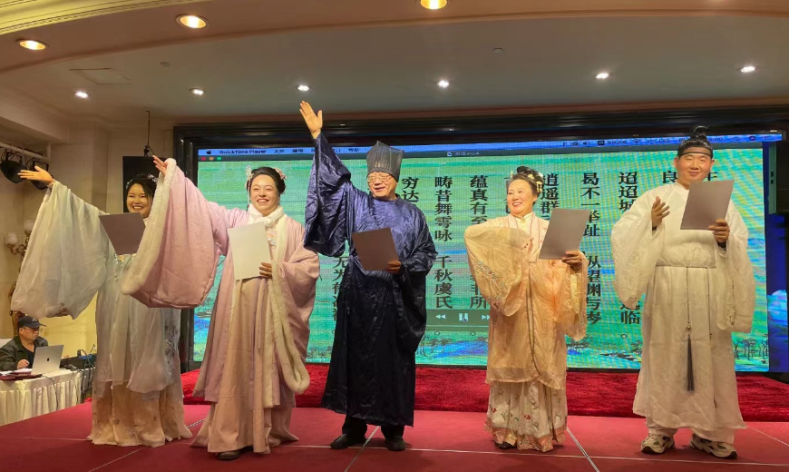 方孝孺研究中心理事长方成健在总结时指出方孝孺事迹的传播,不仅仅要依靠老一辈的专家学者,更寄希望于生机勃勃的中青年学者和青少年学子。最后,文旅学院赵贤德教授、焦炯炯、刘晓丽博士身着华服,朗诵了方孝孺的《上巳约友登南楼》,感情饱满,极富感染力,展现了文旅学者赓续文脉的使命担当,得到了主办方和与会嘉宾的一致好评。