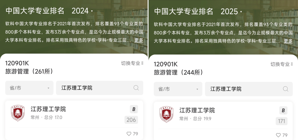 2025年软科中国大学专业排名中,旅游管理专业更是取得了瞩目进步,从全国第206位跃升至第171位(共244所大学上榜),大幅上升35个位次,并稳居B级行列。值得一提的是,软科排名仅收录全国开设该专业的前50%高校,这一进步充分体现了我院旅游管理专业建设的扎实成效与不断提升的学科影响力。