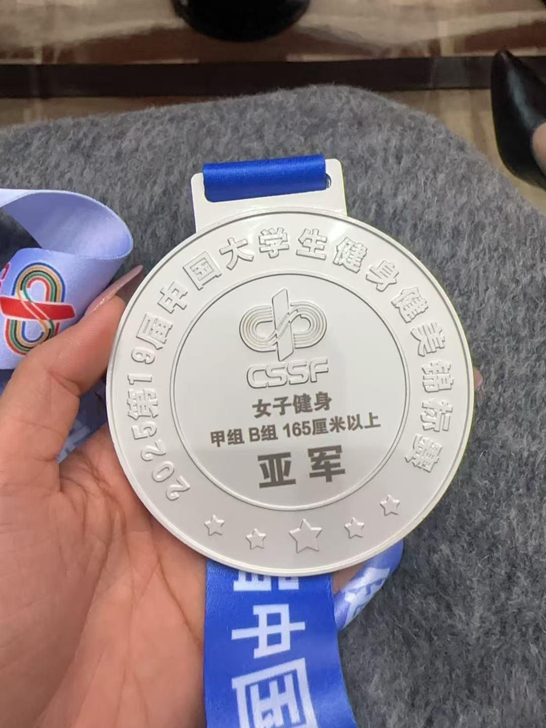 备赛期间,在我校体育学院王鑫老师专业指导下,张艺馨同学严格遵循训练计划,反复打磨动作细节,克服了高强度训练、低钠饮食、灌水脱水等多重挑战。决赛当天,由于赛场未加装缓冲地毯,张艺馨同学需要在硬质地板上完成全套技巧动作,走下舞台才发现脚背的擦伤开始渗血,膝盖也因碰撞出现了明显淤青。但即便如此,她仍坚持完成了形体展示,最终取得甲组女子健身B组第二名的好成绩。张艺馨同学用汗水与坚持诠释了挑战极限、超越自我的体育精神,同时也展现出文旅学子勤勉自律、勇于突破的精神风貌。