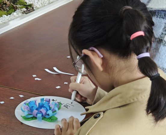 亲子手工环节成为传递温情的重要载体。“文小青”迟媛为每个小学生分发彩纸、剪刀、胶水、细铁丝等材料,指导大家合作制作手工菊花。孩子们专注地折叠花瓣、粘贴,家长们则在一旁协助。指尖翻飞间,一朵朵色彩鲜艳、形态逼真的手工菊花逐渐成型,有的小朋友还在花瓣上写下对长辈的祝福话语。欢声笑语中,亲子协作的默契悄然升温,手工菊花不仅承载着对传统节日的理解,更凝聚着孩子们对长辈的敬爱之情。