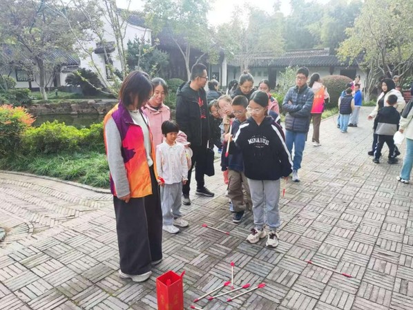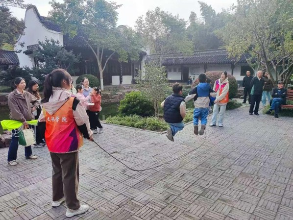 趣味运动环节为“时光胶囊”注入了鲜活活力。现场设置投壶与跳绳两项经典运动,既呼应传统又兼顾趣味。投壶作为古代文人雅士的重阳雅趣,考验着参与者的专注力与协调性;跳绳则以简单轻快的形式,传递着健康长寿的美好祝愿。大家踊跃参与,或屏息凝神瞄准投壶,或轻盈跳跃翻飞绳间,欢声笑语中,不仅体验到运动的快乐,更以现代方式复刻了传统节日的互动氛围,让敬老爱老的理念在趣味中传递。
