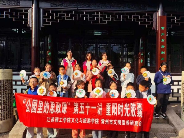 为传承中华优秀传统文化,弘扬尊老敬老的传统美德,10月26日,文化与旅游学院联合常州市文明素养研究会赴荆川公园、东坡公园共同举办了一场兼具文化深度与互动趣味的重阳节活动。活动通过追溯节日渊源、品读经典诗词、解读传统习俗、制作手工菊花、开展趣味运动等形式,让小学生在沉浸式体验中,将重阳文化与温暖时光一同“封存”于心。