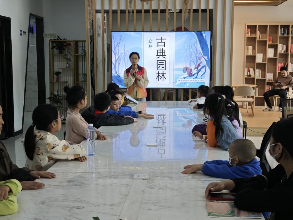 活动中,“文小青”志愿者仲晴晴、葛新苗带领大家共同解码古典园林的美学核心——和谐共生。立冬后的园林更显韵味:红叶铺阶、落叶归根,沉稳的建筑在清冷氛围中更具风骨,尽显“天人合一”的审美追求。此外,分享还聚焦园林“藏”与“养”的独特意境,山、水、木、人共生构成“养”的生机之态,让参与者深刻体会园林设计的匠心巧思。