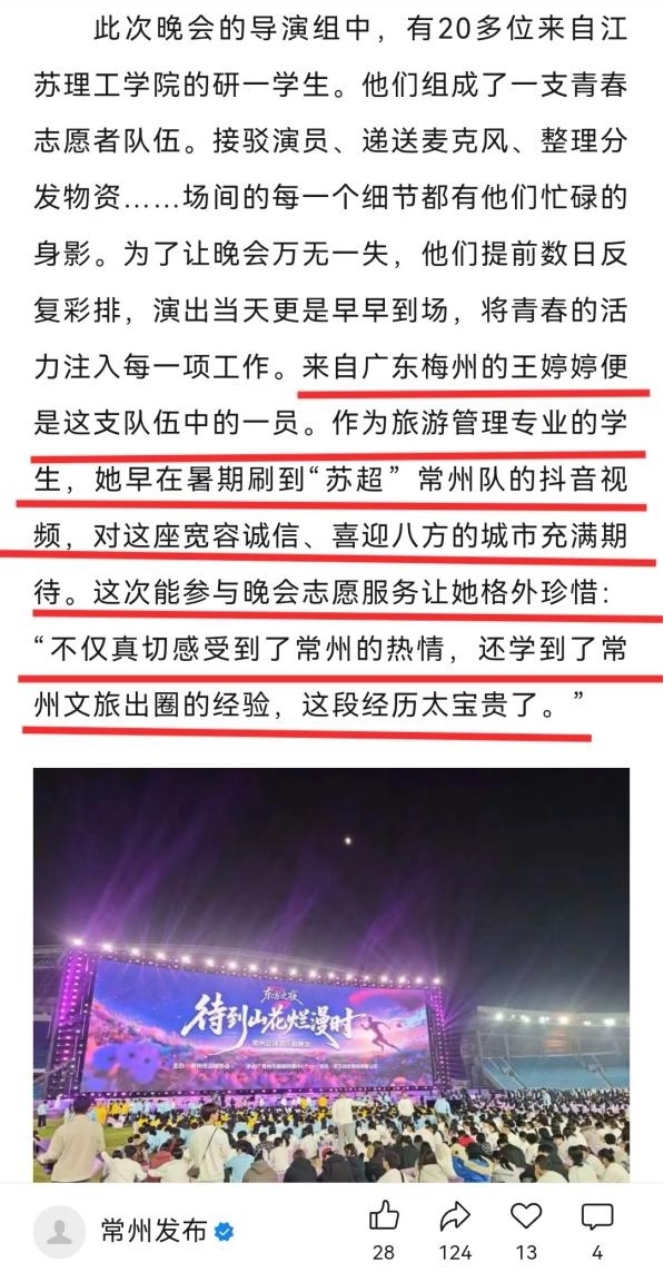 对文旅学院而言,此次志愿行动并非单纯的服务参与,更是“实践育人、产教融合”理念的生动落地。从导演组的后台统筹到观众引导组的一线服务,三位研究生既用专业能力助力城市文旅活动顺利开展,更在实践中完成“从理论认知到现实感知”的跃迁——他们读懂了“活动组织是细节的艺术”,也理解了“文旅服务是温度的传递”。其中,王婷婷还有幸作为志愿者代表接受官方媒体采访,相关报道在“常州发布”“常观”两大平台刊发。谈及此次采访,她感慨道:“很意外‘小小的’志愿者能得到如此关注,常州对志愿服务的珍视,让我真切感受到这座城市‘心系每一个普通人’的温度;也更懂了文旅服务‘以小见大’的意义——文旅活动从来不是‘舞台上的表演’,而是从后台到台前、每一份用心的串联。”