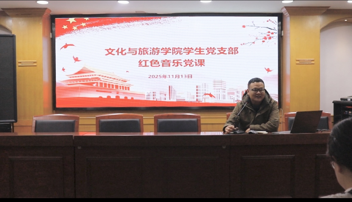 为深入学习贯彻习近平新时代中国特色社会主义思想,大力弘扬伟大建党精神、赓续红色血脉。11月13日,文化与旅游学院学生党支部组织开展“弘扬伟大建党精神赓续红色血脉”主题党日暨红色音乐党课。学院特别邀请马克思主义学院邵鹏宇老师为全体学生党员带来一堂题为《讴歌伟大建党精神始终坚定理想信念——百年党史中流淌的红色音符》沉浸式音乐党课。活动由学生第二党支部书记杨婷婷主持,学生党支部全体党员、发展对象参加此次音乐党课。