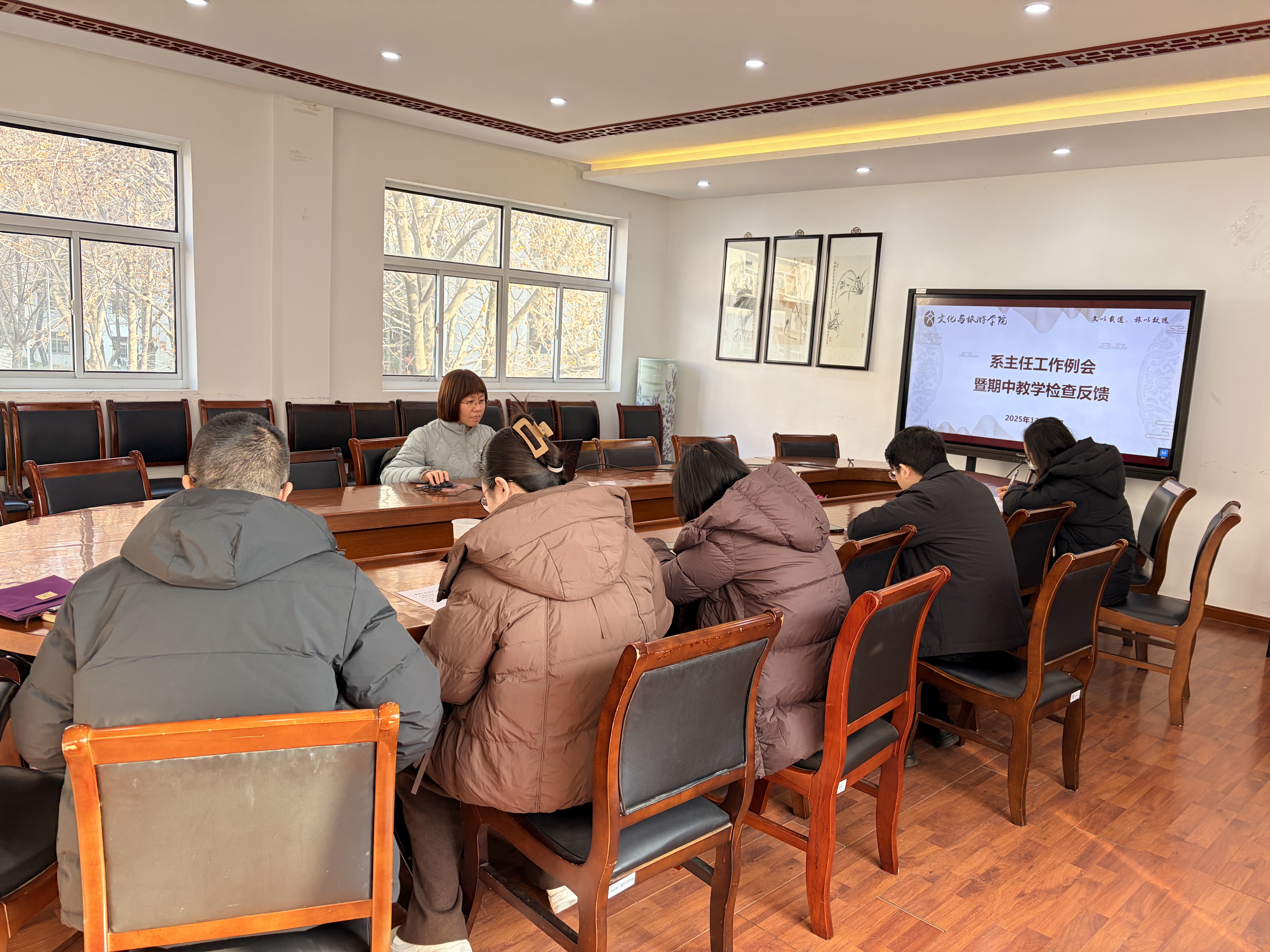 12月25日,文旅学院在19号楼222会议室召开系主任工作会议暨期中教学检查反馈会。会议由副院长张丽芬主持,各系主任全员参会。