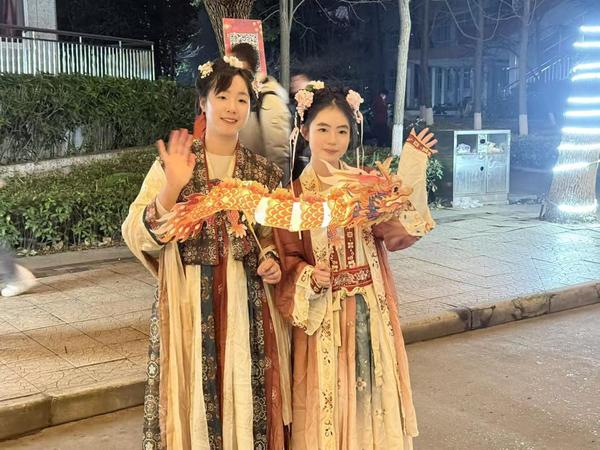 活动现场,来自文旅学院的汉服社同学们格外引人注目。她们身着形制规整、纹样精美的传统汉服,梳着雅致发髻,踏灯而行、浅笑嫣然,与满园花灯、亭台楼阁完美相融,尽显东方古典之美。行走在灯廊之中,她们或驻足赏灯,或轻声解谜,或聆听乐曲,一举一动尽显温婉大气,不仅生动还原了传统元宵踏灯赏景的习俗风情,更向现场师生、外国友人展示了汉服文化与传统节日的独特魅力,用青春姿态诠释传统文化之美,成为元宵灯会中最具古韵的风景线,赢得了大家的一致称赞。