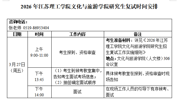 2026年江苏理工学院文化与旅游学院研究生复试时间安排